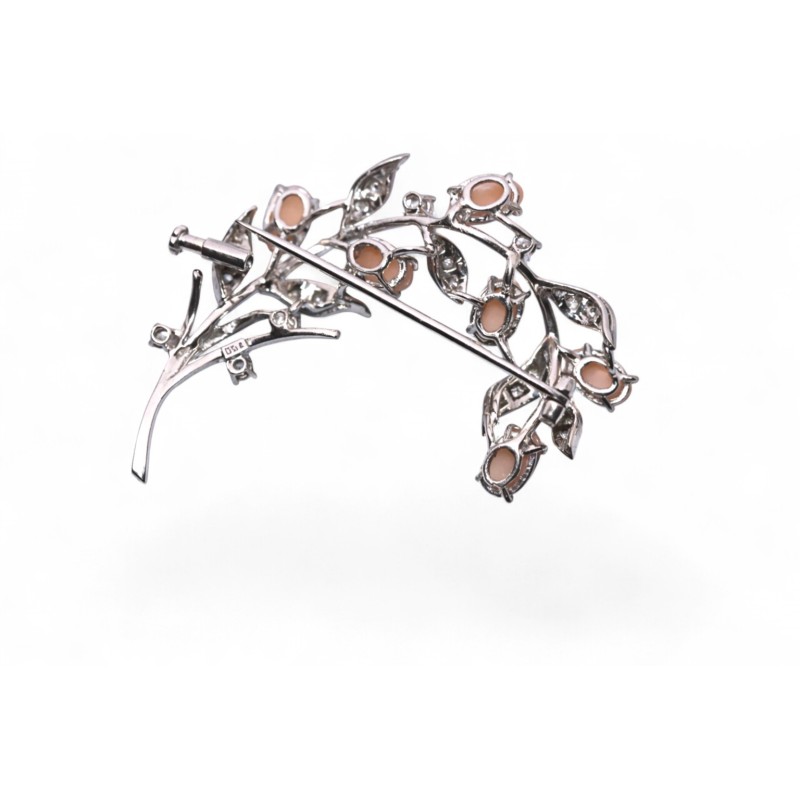 Broche en or blanc 18 carats ornée de corail peau d'ange et de diamants.